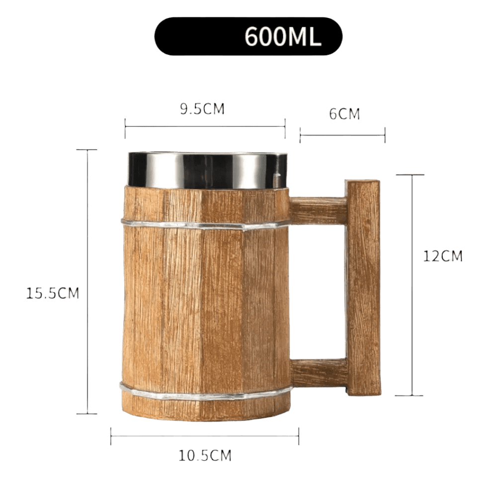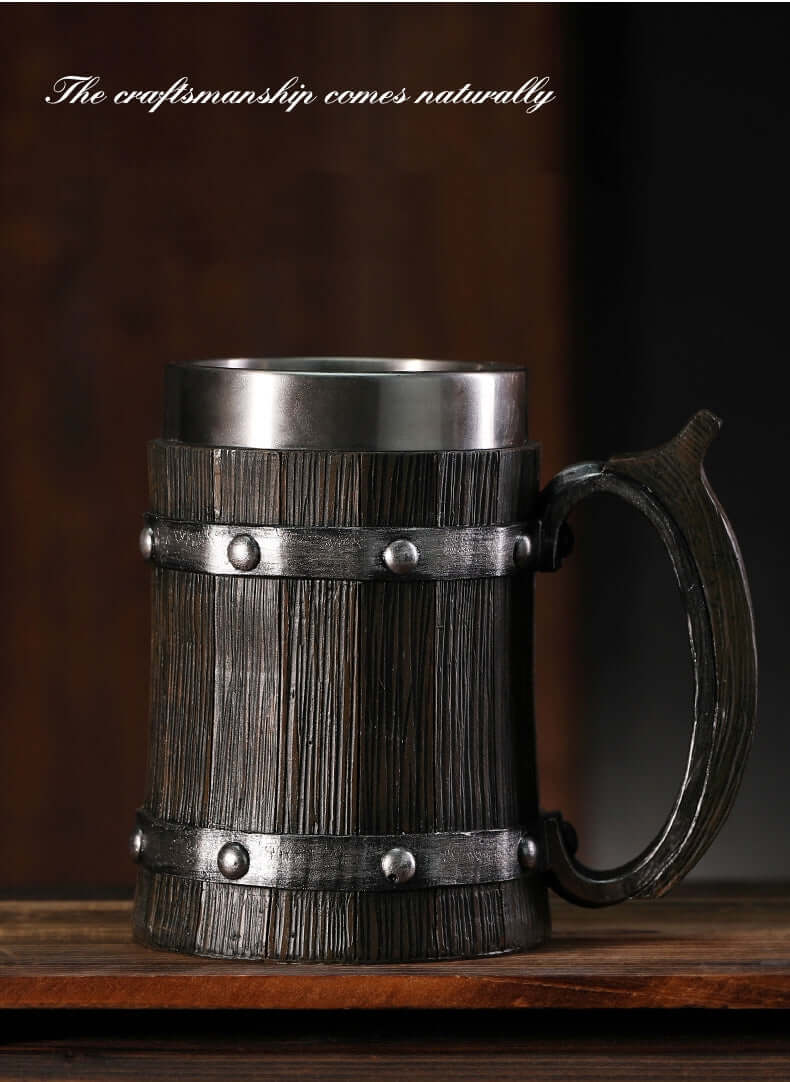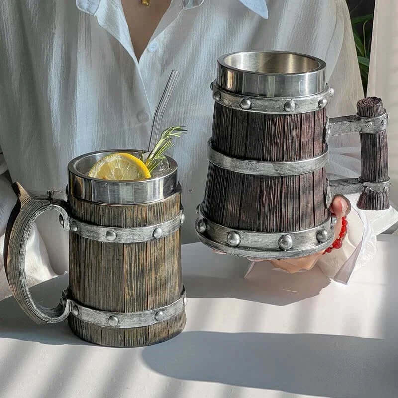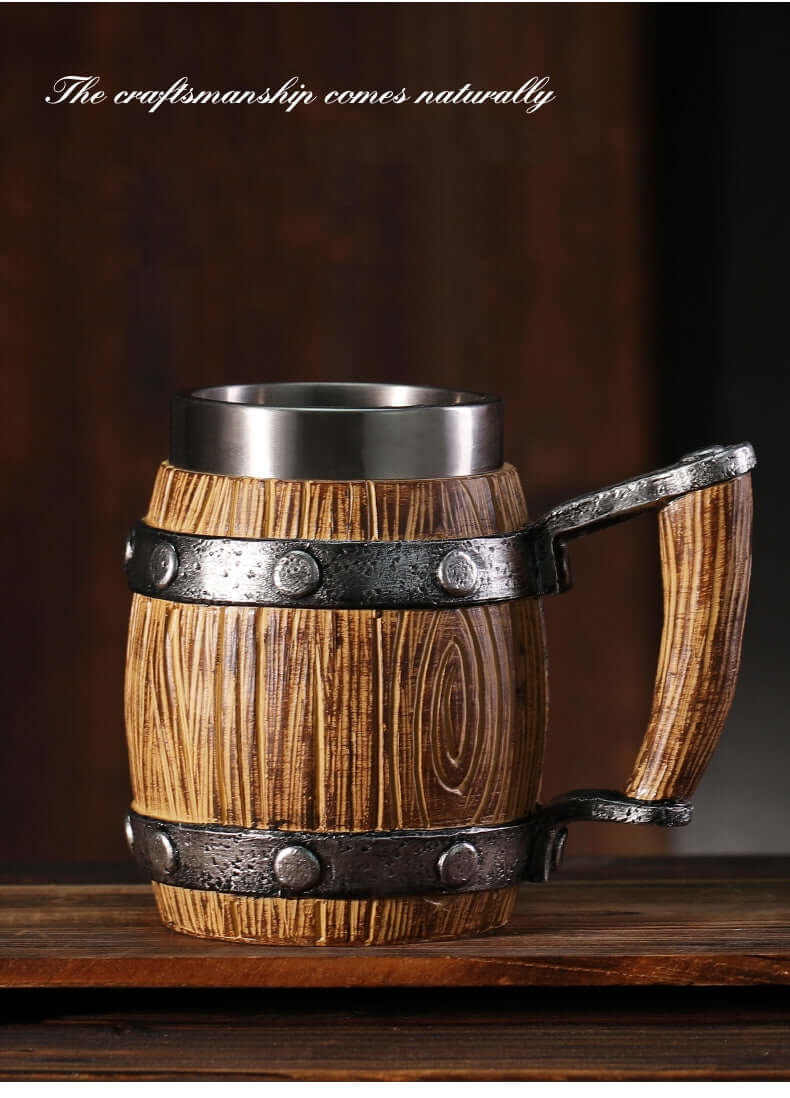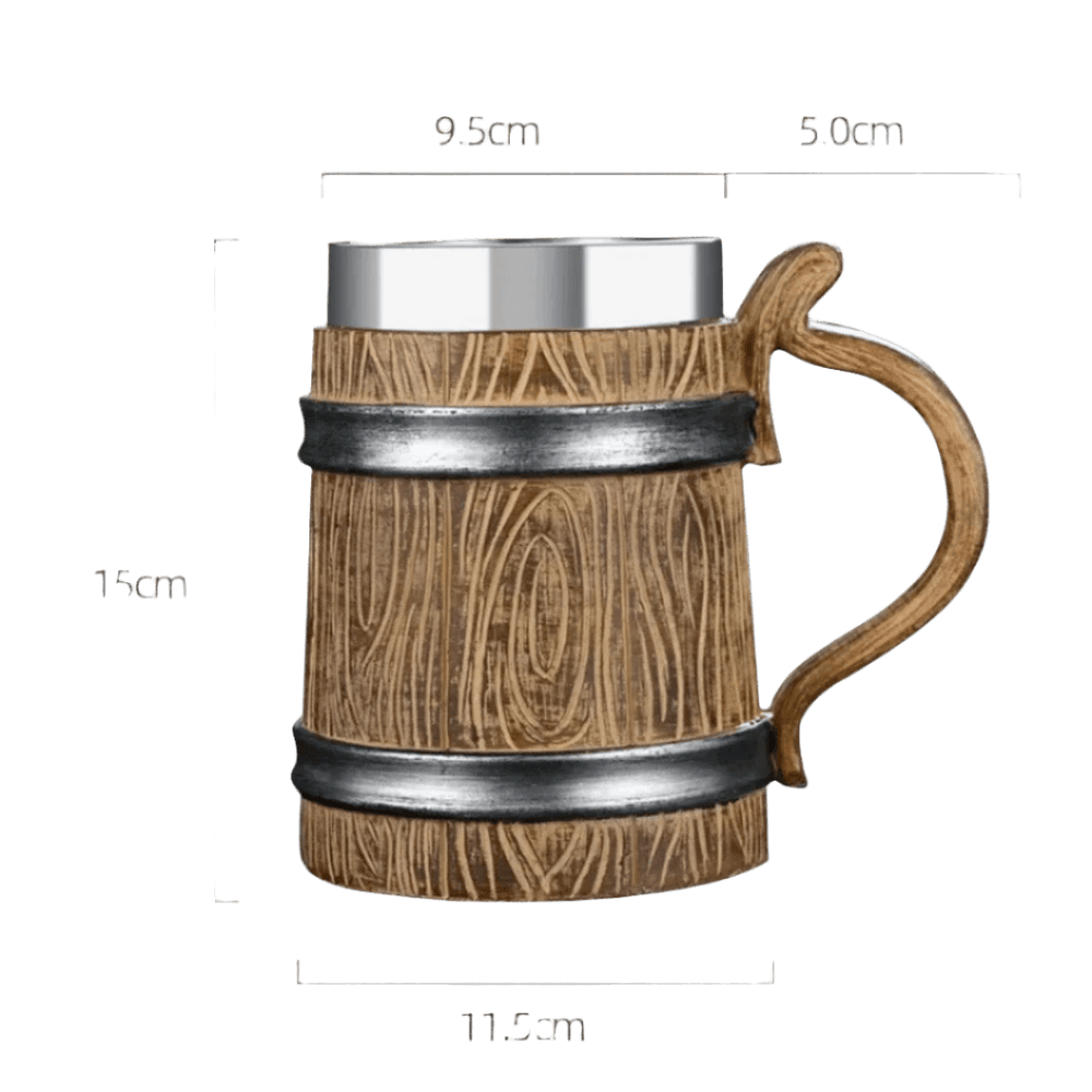 Raise your spirits with our Viking-Style Wood Beer Mug, as if toasting in the halls of Valhalla! Each mug is uniquely handcrafted from high-grade resin, featuring a food-grade stainless steel interior, and a mid-band that boasts a hammered look, resembling artifacts from the Viking era.