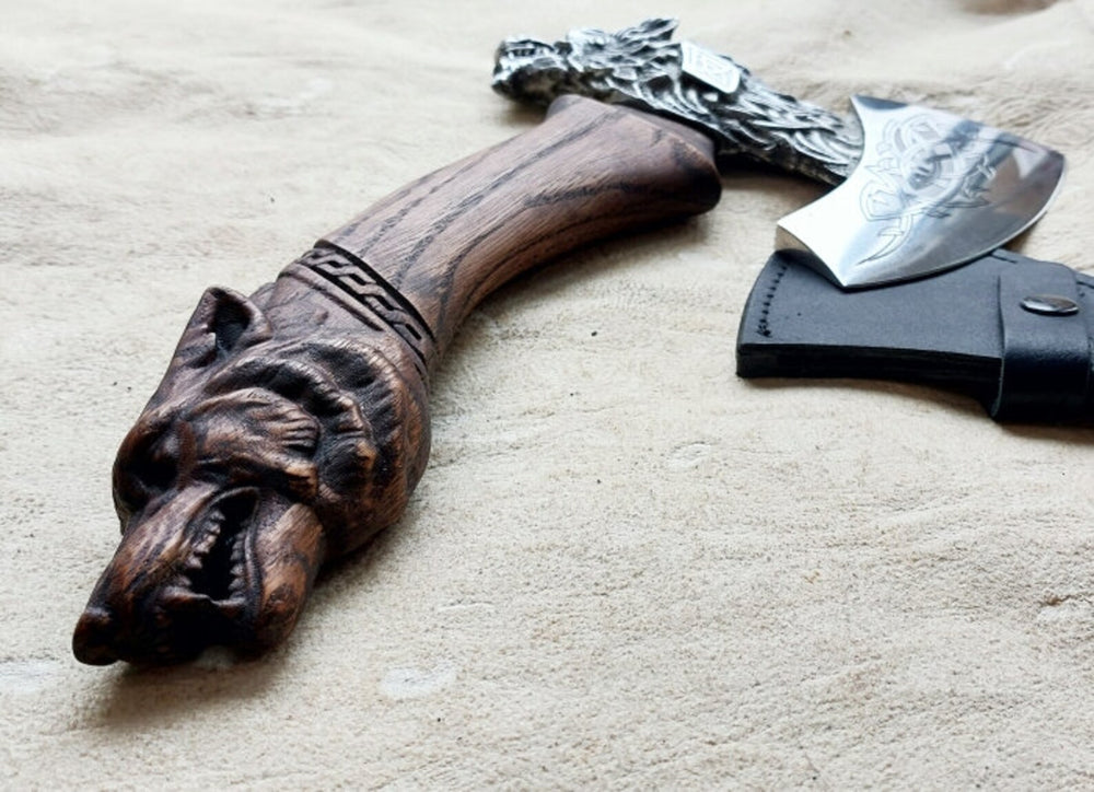 - Ash Wood Handle with Artistic Carvings – Intricate Norse designs bring the legend of Fenrir to life.