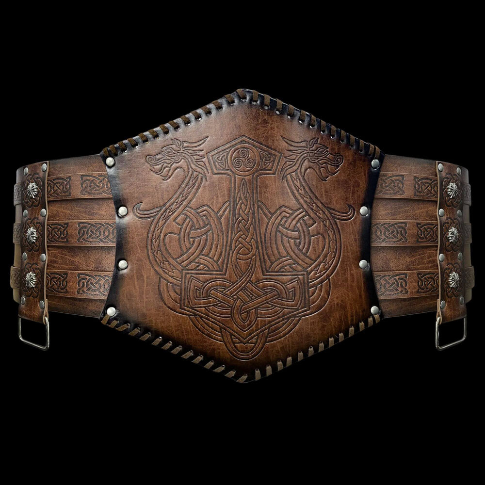 This belt embodies the essence of Viking craftsmanship and tradition. Each intricate detail, from the embossed patterns reminiscent of knork to the Norse motifs, tells a story of resilience and power.
