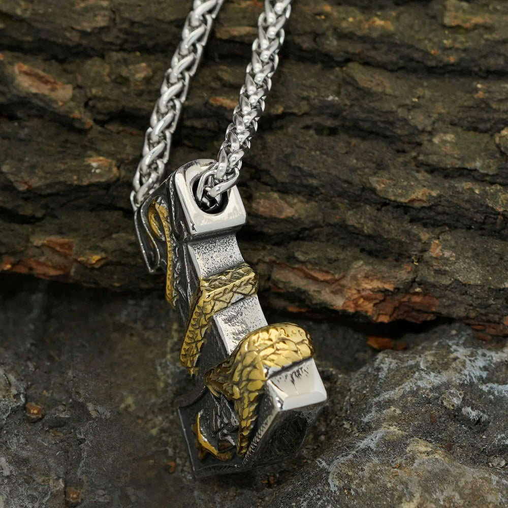 The "Jörmungandr Surrounding Mjölnir Necklace" features Thor's hammer, Mjölnir, symbolizing strength and protection, encircled by the World Serpent, Jörmungandr. This intricately crafted piece reflects Norse craftsmanship and serves as a powerful symbol of resilience and courage, connecting you to Viking lore and epic sagas.