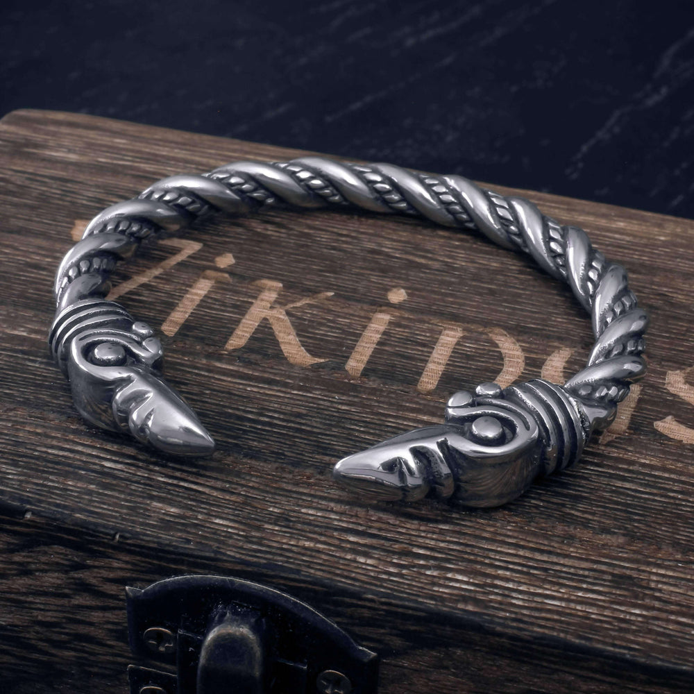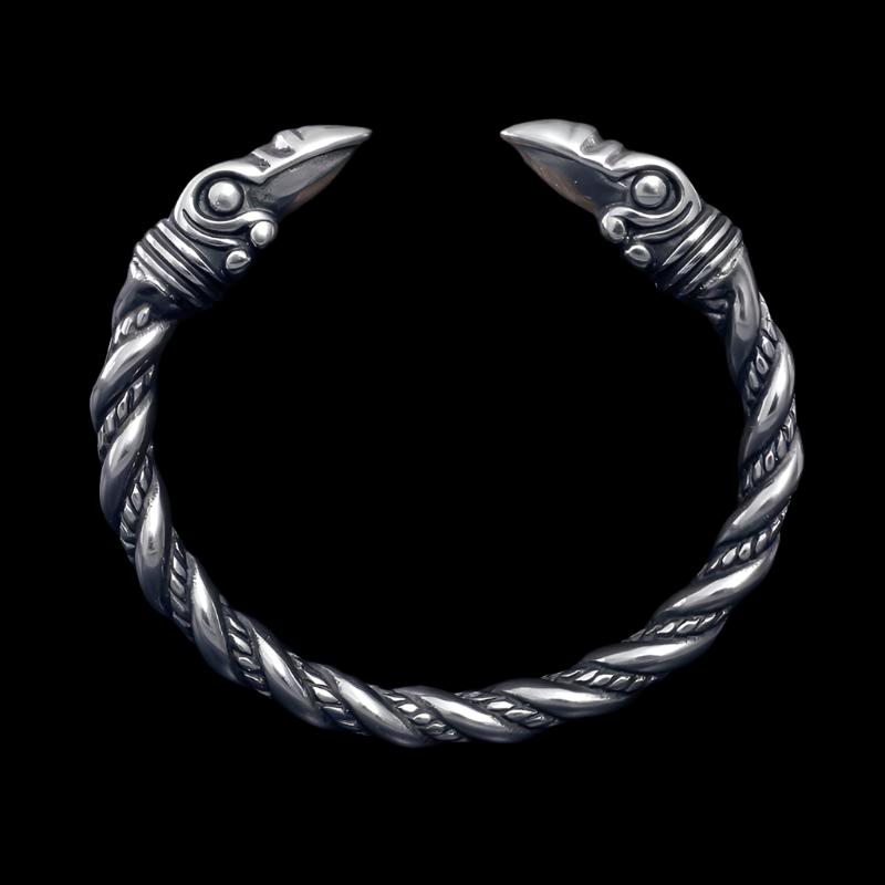 This adjustable Viking bracelet, featuring raven heads, is available in two patterns, including a twisted wire variant for larger wrists. Ravens, Odin's companions in Norse mythology, symbolize wisdom and foresight, represented by Hugin and Munin. Odin, known as the raven lord, valued these birds highly in Nordic society.