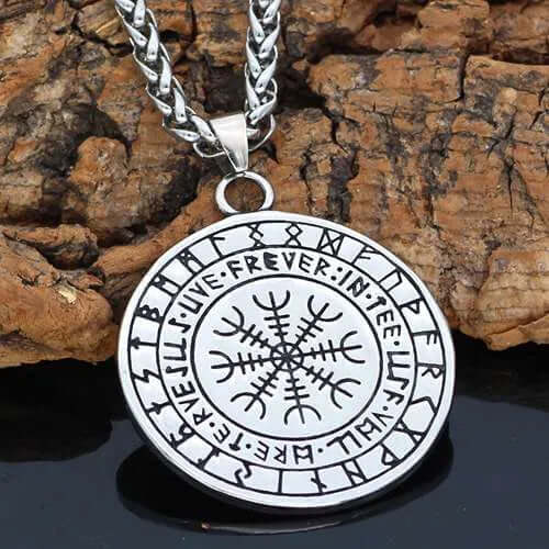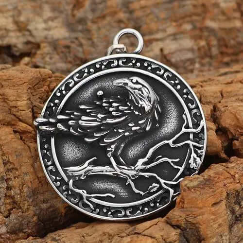 The front of this pendant shows a mysterious raven standing on a tree branch, the representative of wisdom, courage and strength in the Nordic culture; while the back is engraved with a mysterious runic compass, which represents navigation and exploration, leading us to explore the unknown world.