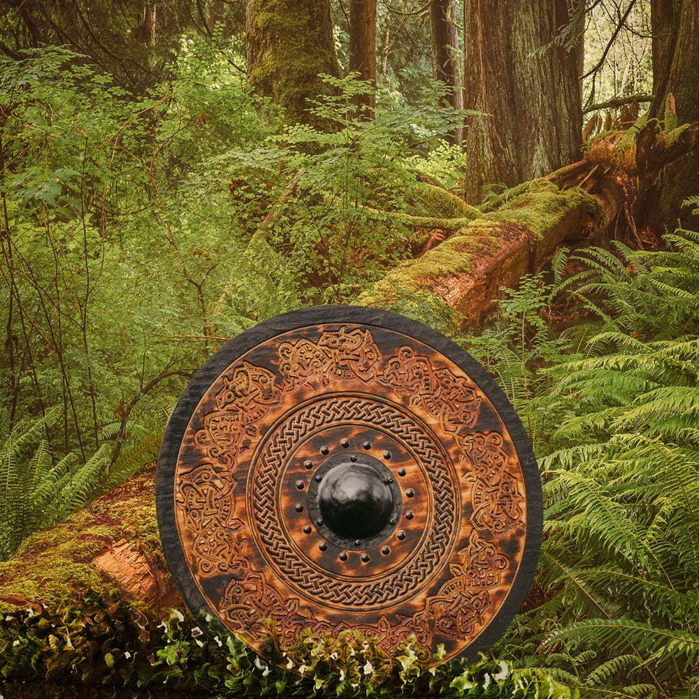 Embrace the mystique of Viking lore with the Dark Stained Drake Knotwork Shield—a masterful creation inspired by ancient Nordic designs. With its 24-inch diameter and dark stained finish, this shield exudes the essence of a bygone era, where intricate knotwork patterns symbolize strength and unity. Crafted from robust birch plywood and reinforced with steel and iron, this shield is not only a testament to Viking craftsmanship but also a versatile piece for reenactments, LARP, or as a striking addition to your home decor.