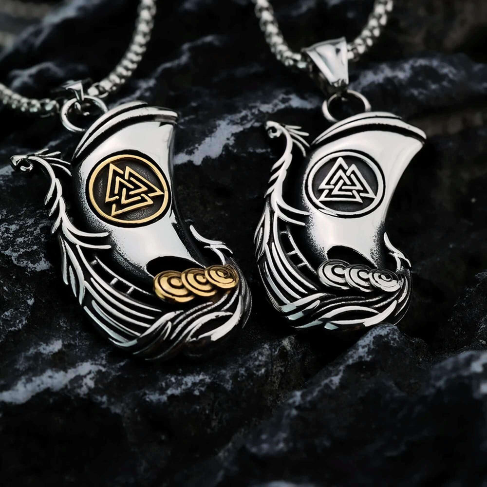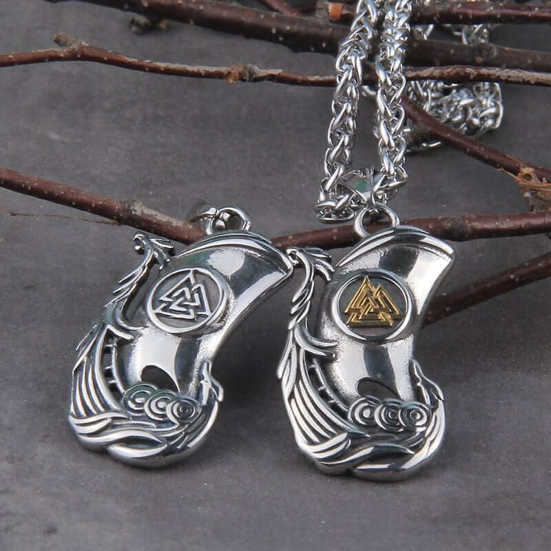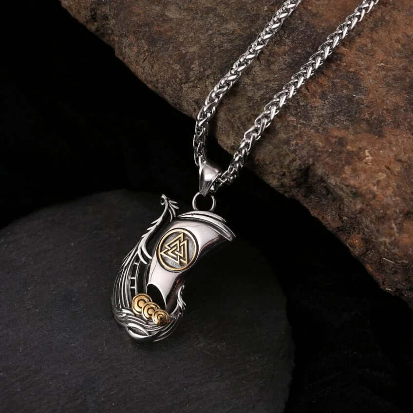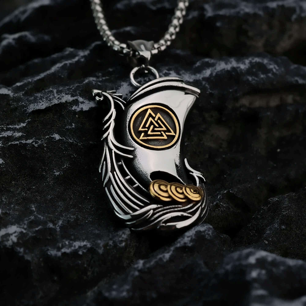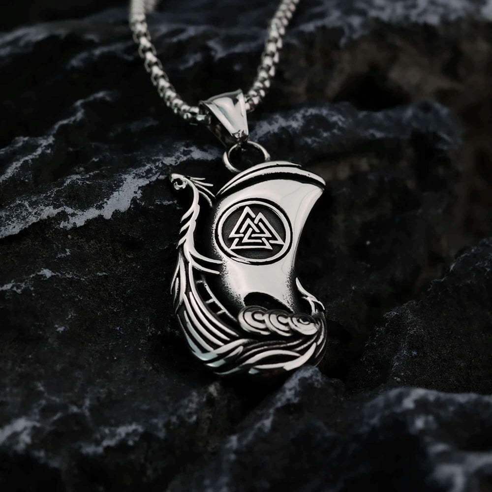 The Longship Valknut Necklace, inspired by Viking longships, features intricate carvings and the Valknut symbol, representing life, death, and rebirth. Embrace your warrior spirit and carry the essence of the Viking age with you on your odyssey.