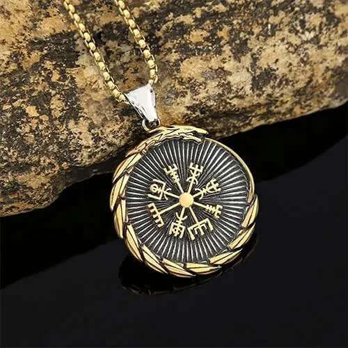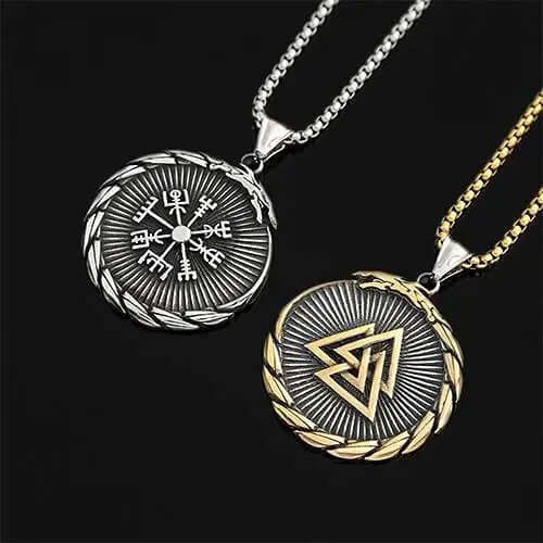 An amulet that combines strength and mystery. Both sides are adorned with vivid depictions of dragons, symbolizing power, courage, and protection. The front features the valknut, representing bravery, battle, and glory. On the back, the enigmatic vegvisir guides you towards the path of success and happiness.