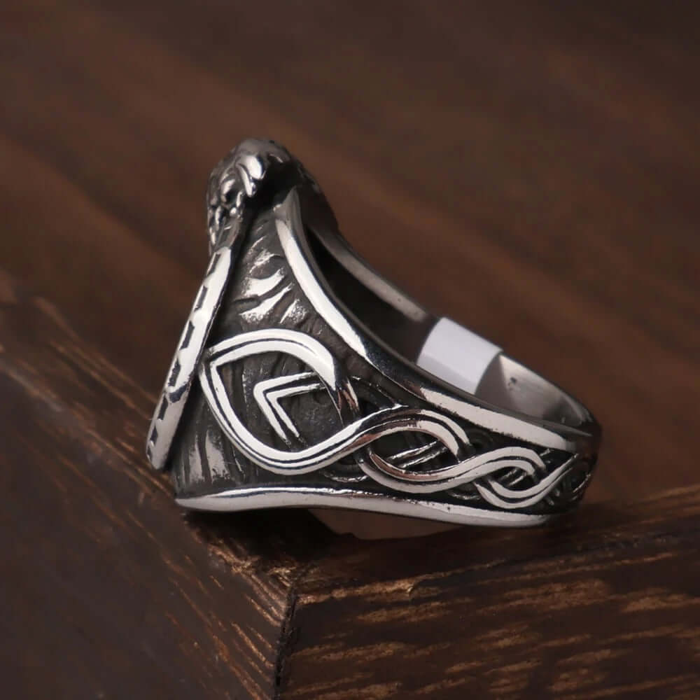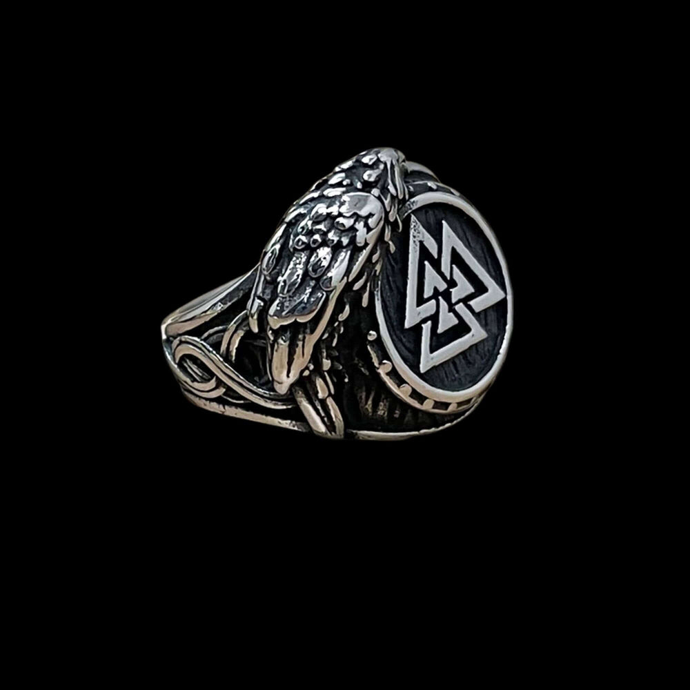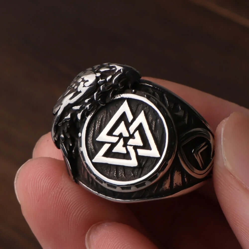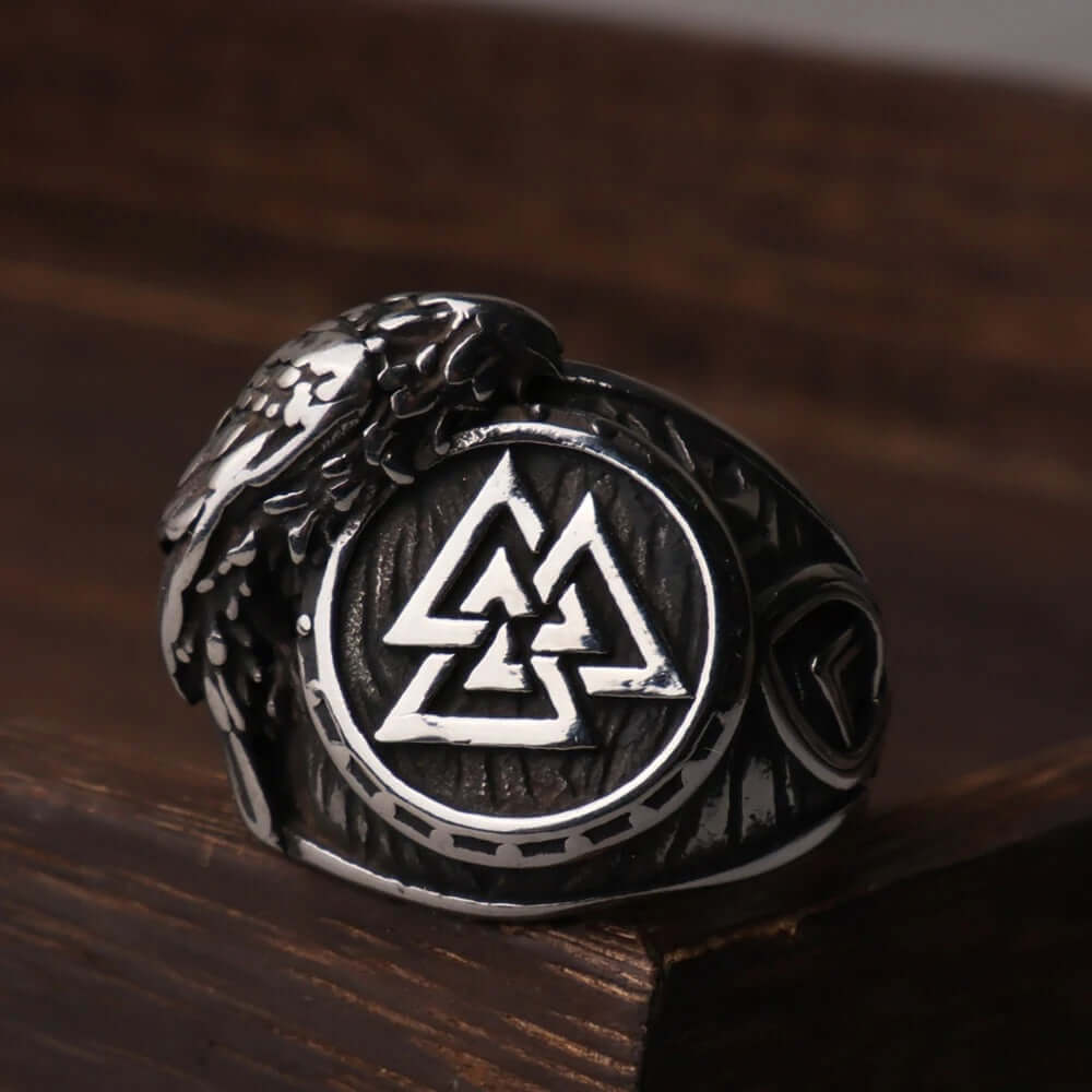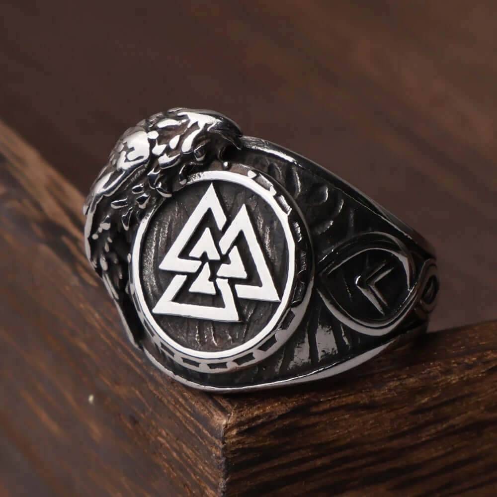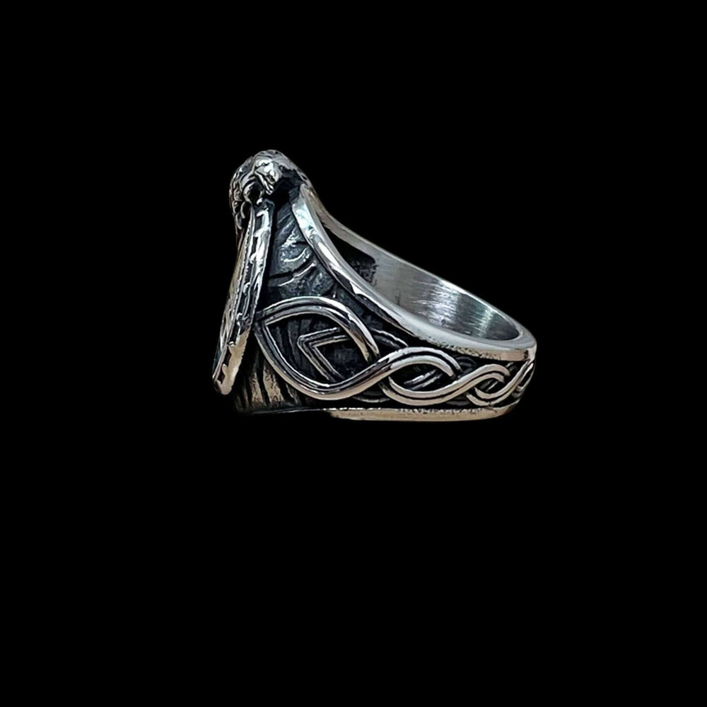 Channel the wisdom and power of the Allfather with our Odin's Raven and Valknut Ring. This captivating piece features the iconic ravens, Huginn and Muninn, alongside the Valknut symbol, representing Odin’s insight and the interconnectedness of life and death. Crafted from premium stainless steel, the ring is designed with intricate details that honor Viking heritage. This ring is perfect for those who seek to embody the profound knowledge and mysticism of Odin.