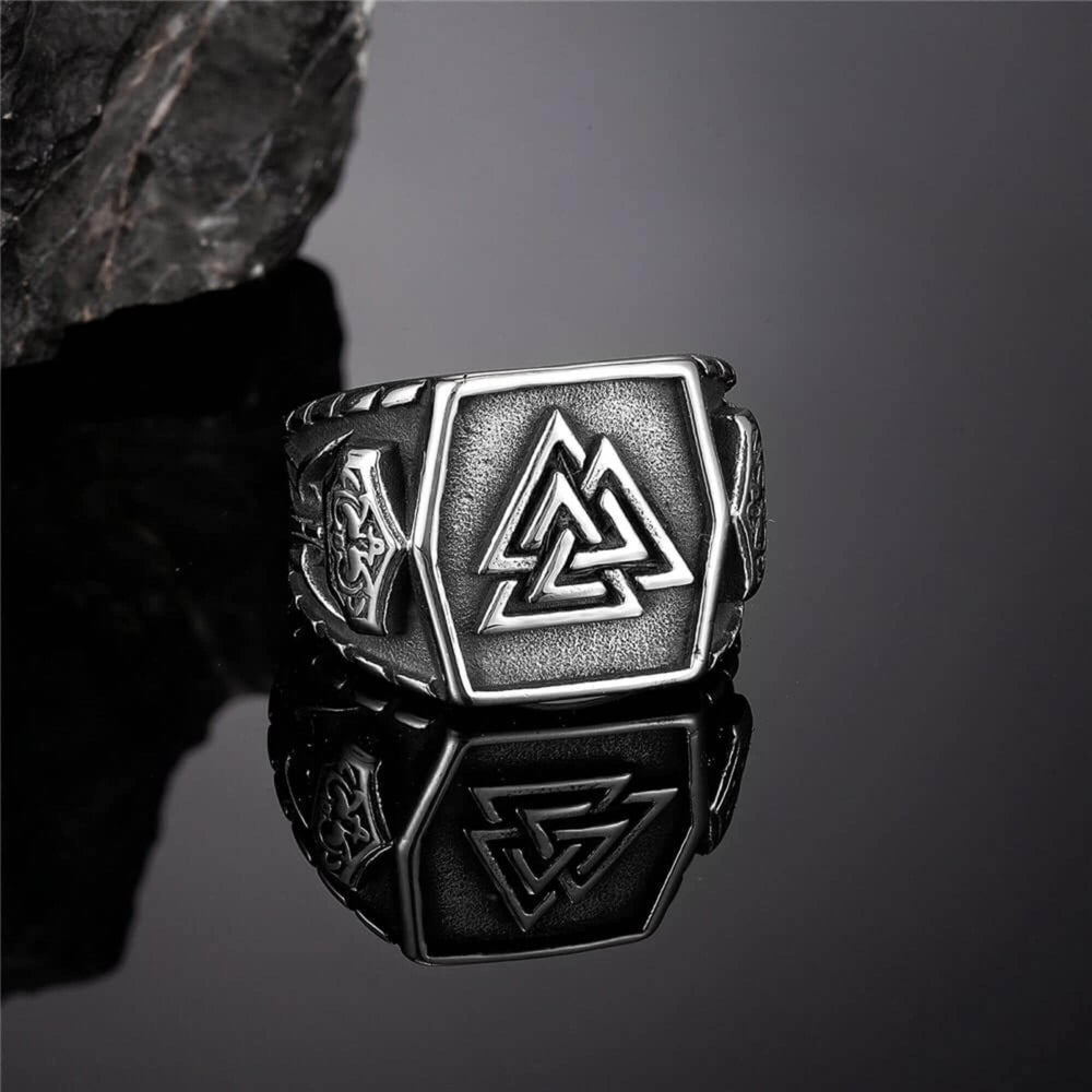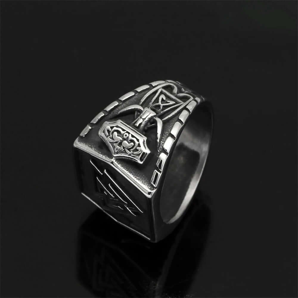 Step into Norse mythology with our Steel Valknut and Mjölnir Ring. Combining the Valknut, symbolizing the slain warriors' journey to Valhalla, and Mjölnir, Thor's hammer of protection and power, this ring honors Viking heritage. Crafted from premium stainless steel with intricate designs, it's perfect for those seeking strength and protection, embodying Norse legends.