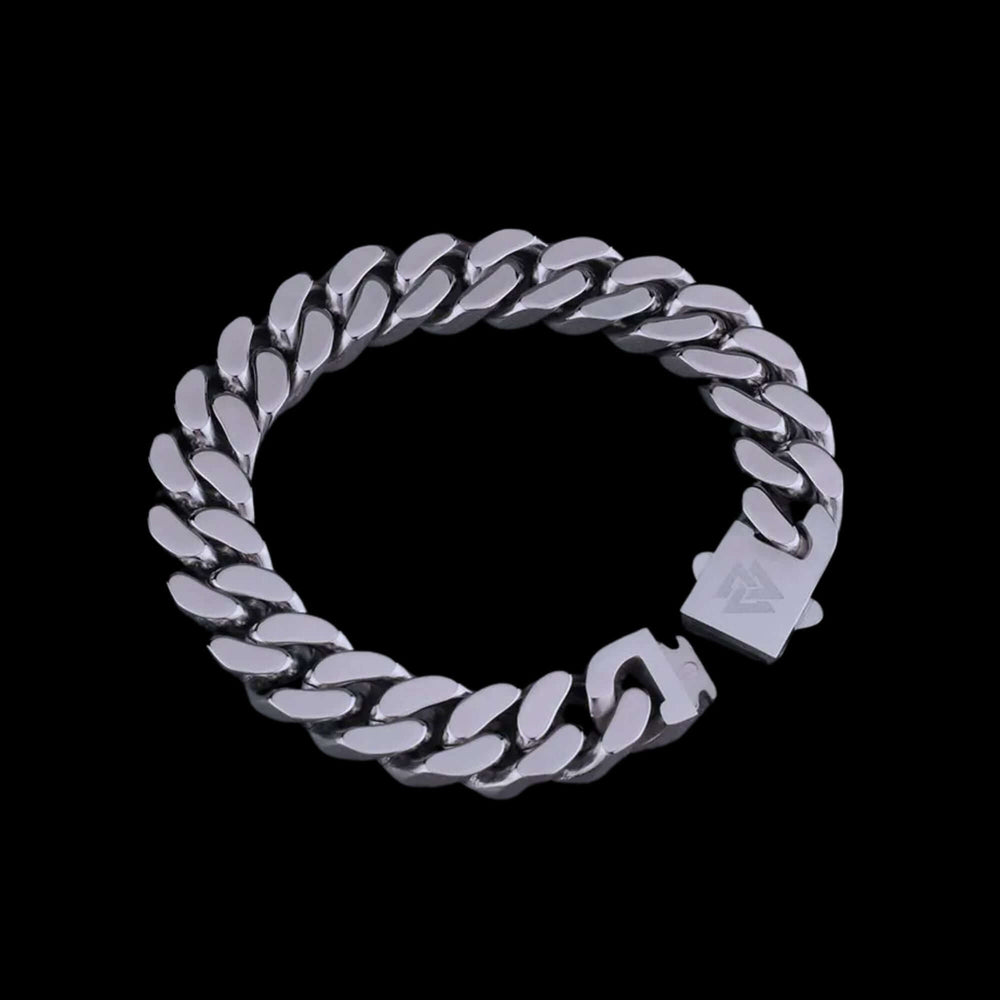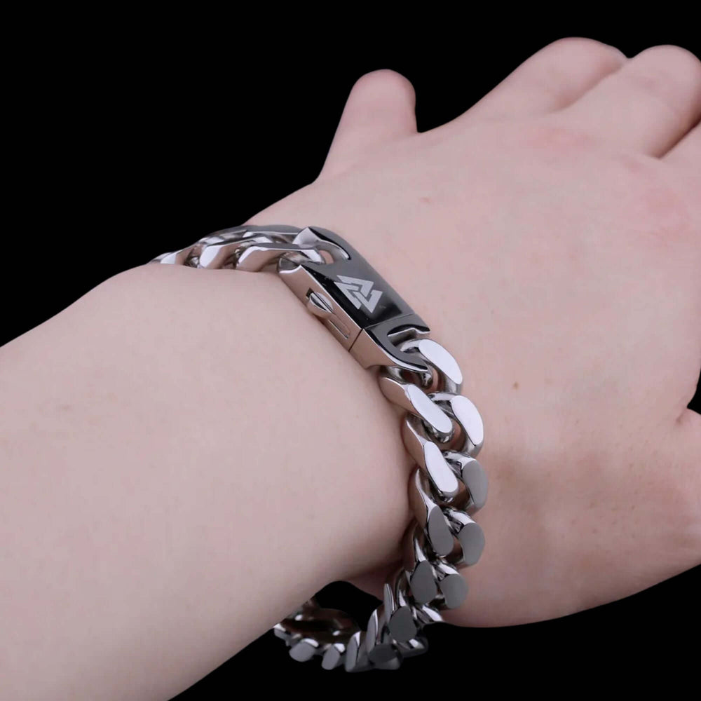 Woven into the robust links of a meticulously crafted Cuban chain, this durable and comfortable bracelet features the powerful Valknut emblem, representing the warrior's journey through life and death. As you fasten it around your wrist, feel the ancient energies of the Norse gods empower you with wisdom and courage, reminding you of your inner strength and unwavering spirit to forge your own path.