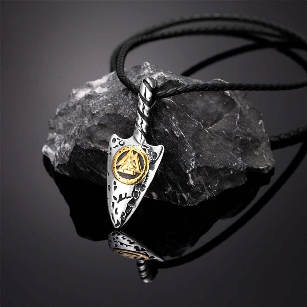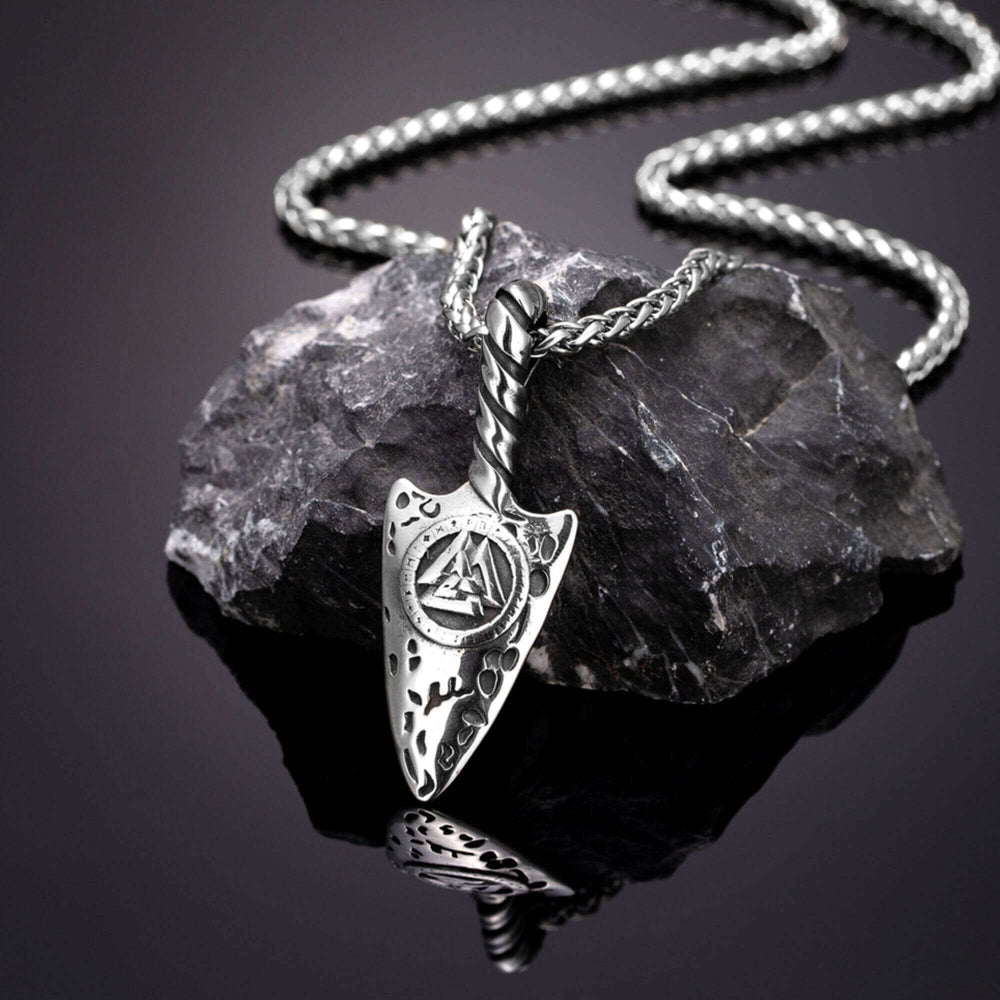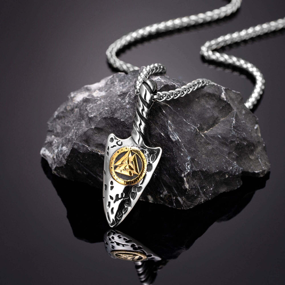 Arm yourself with strength, power, and determination with the Valknut Spear Necklace. Crafted from premium stainless steel, this necklace features a spearhead inspired by Odin's spear Gungnir, adorned with the Valknut symbol for wisdom and courage. Its intricate design, durability, and powerful symbolism make it a treasured addition to any Norse jewelry collection.