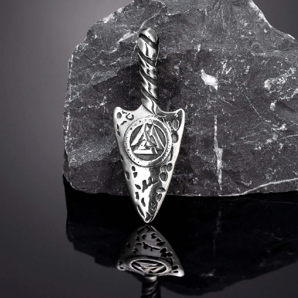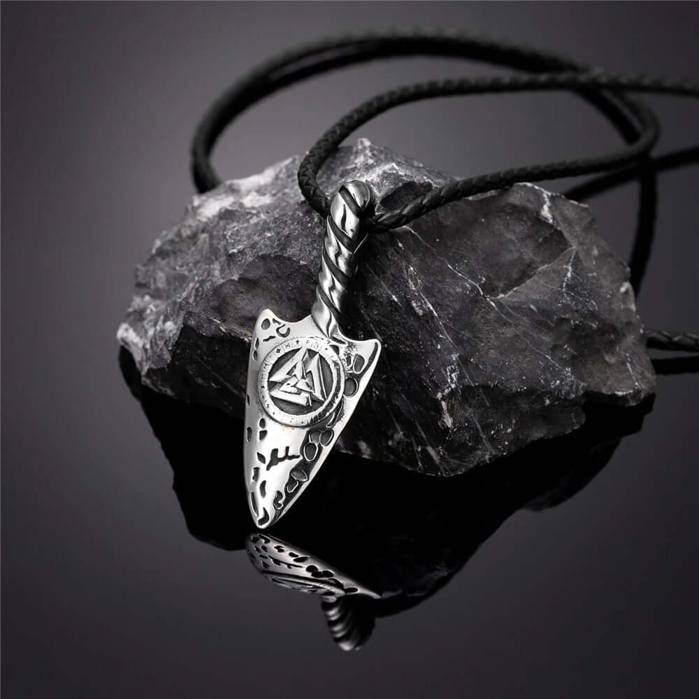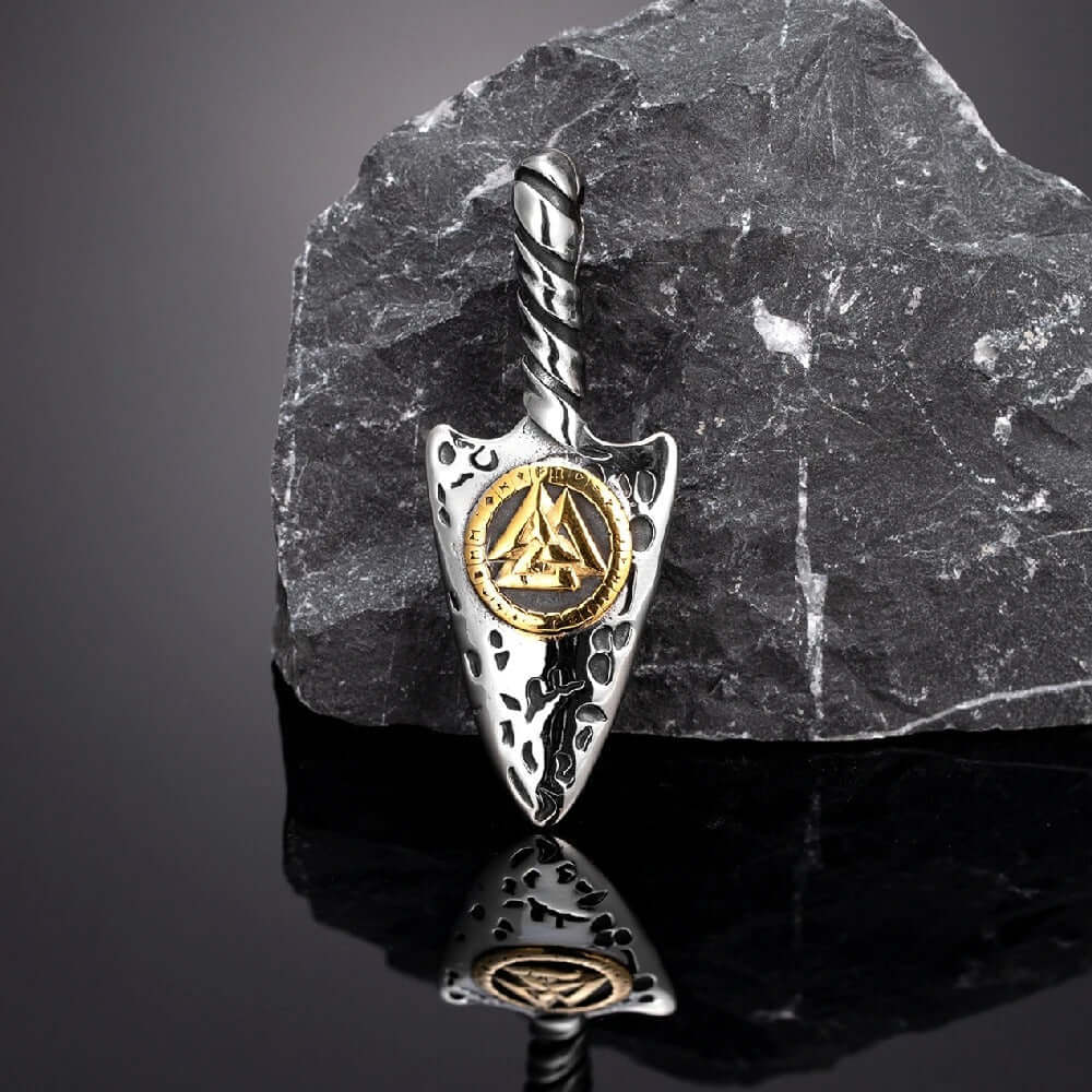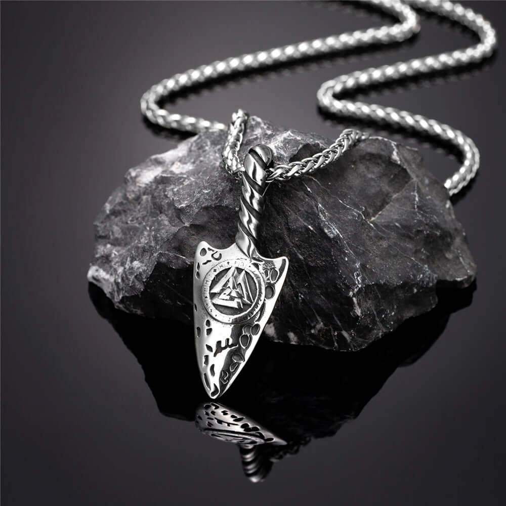 Arm yourself with strength, power, and determination with the Valknut Spear Necklace. Crafted from premium stainless steel, this necklace features a spearhead inspired by Odin's spear Gungnir, adorned with the Valknut symbol for wisdom and courage. Its intricate design, durability, and powerful symbolism make it a treasured addition to any Norse jewelry collection.