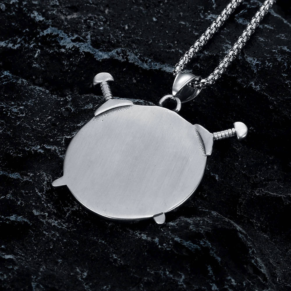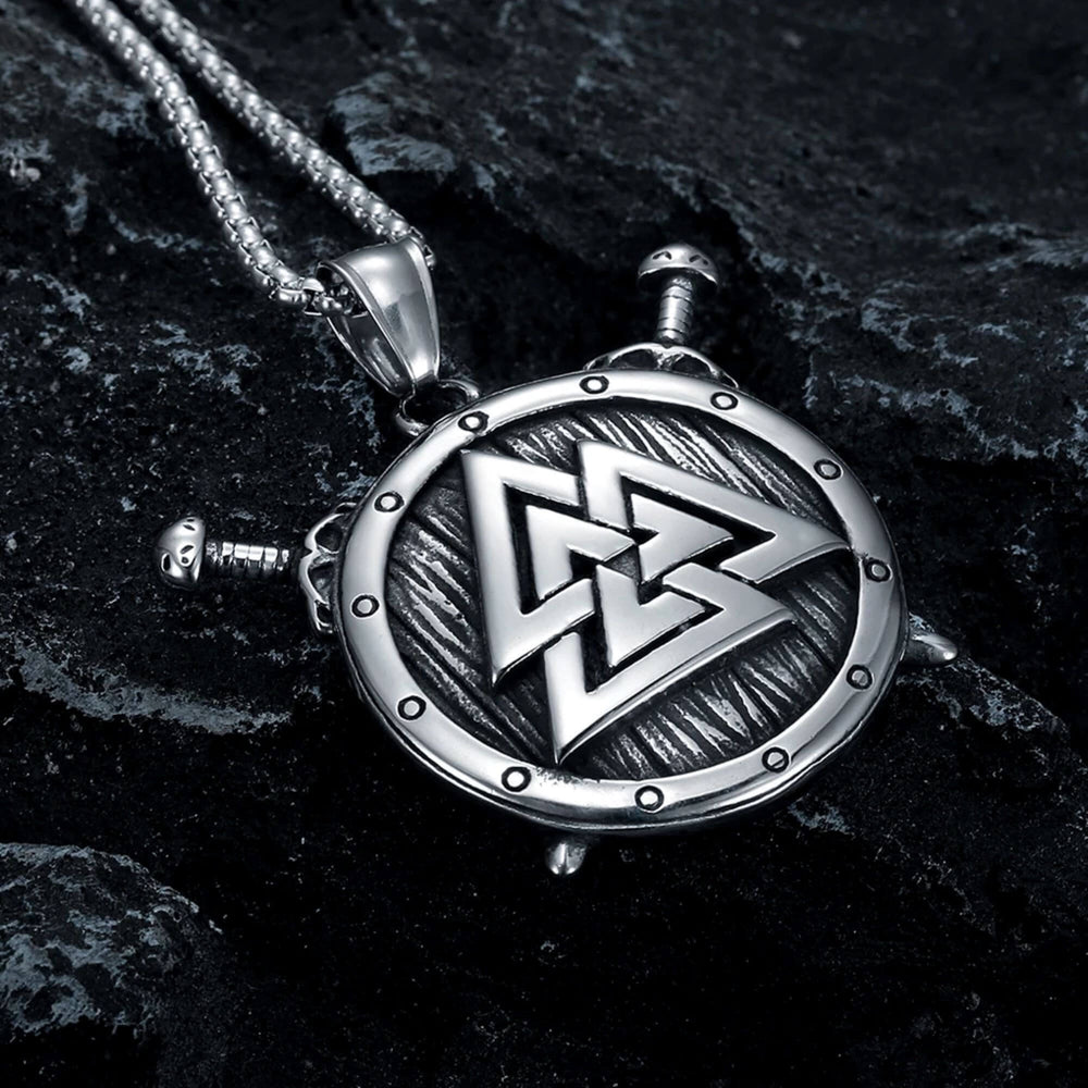 This pendant features a shield with the Valknut symbol, representing Viking valor and divine protection, and crossed swords for strength and courage. Ideal for those who admire Norse culture, it’s a statement of identity, resilience, and honor.