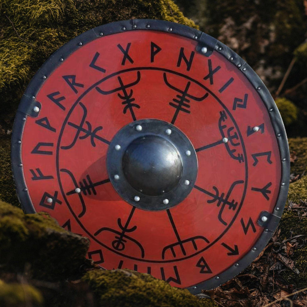 Navigate the realms of Viking legend with the Vegvisir Runes Shield—a symbol of guidance and protection for ancient Norse warriors. The Vegvisir, or Viking compass, was believed to steer its bearer through storms and ensure safe passage, making it a powerful emblem of direction and destiny. This shield, with its striking red finish and detailed Vegvisir runes, embodies the spirit of Viking exploration and conquest, offering a blend of historical authenticity and bold design.