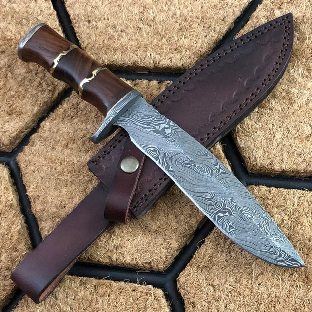 Balanced and sharp, the 8-inch blade is heat-treated to a Rockwell hardness of 55–58 HRC, ensuring lasting performance in the field. The walnut wood handle is reinforced with brass spacers and a Damascus steel guard, creating a grip that is both rugged and elegant. Every detail reflects masterful craftsmanship, from the etched blade to the polished finish. Housed in a hand-stitched cowhide leather sheath, this knife is ready to accompany hunters, collectors, or warriors of spirit.
