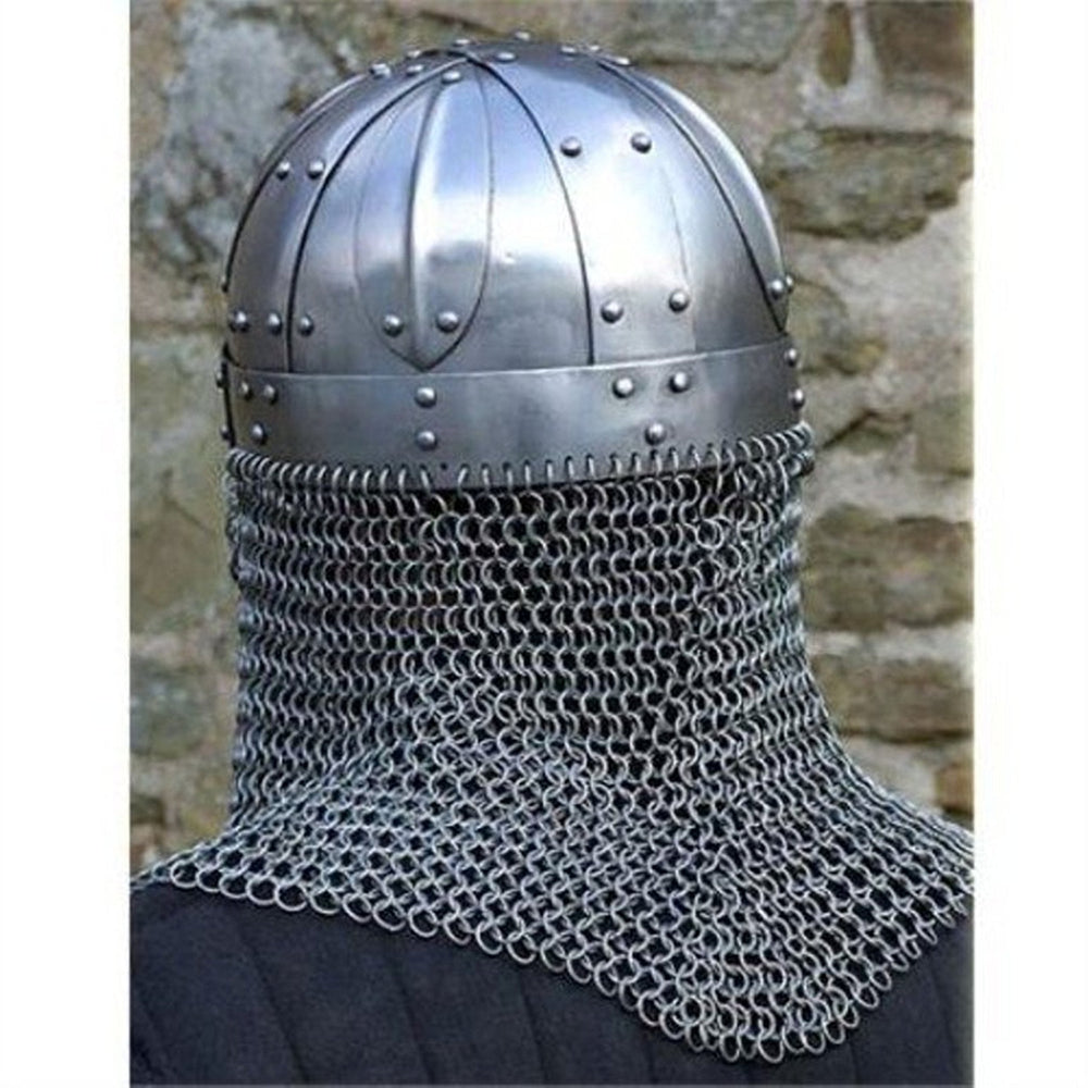 Equip yourself with the Viking Battle Armor Helmet from Tales of Valhalla. Crafted from durable 18-gauge steel, this helmet features a basinet visor for face protection and a flexible chainmail skirt for enhanced coverage. Inspired by the legendary warriors of Norse mythology, this helmet not only showcases intricate craftsmanship but also provides the robust defense necessary for battle. Whether you’re preparing for a reenactment, a LARP event, or simply adding to your collection, this helmet embodies the strength and spirit of the Viking age.
