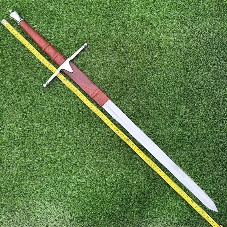 This replica pays homage to that heritage with a Damascus steel blade, beautifully patterned with waves and geometric etchings. The dark leather-wrapped handle provides both grip and elegance, balanced by a brass-colored guard and pommel that echo traditional designs. Included is a dark brown leather scabbard, making it perfect for display, cosplay, or reenactment.