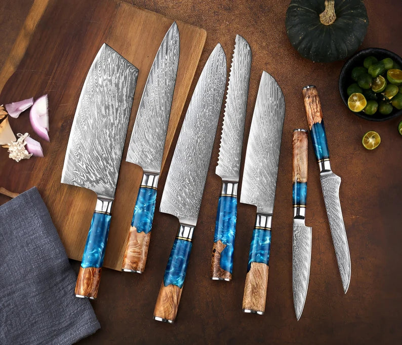 The Blue Resin & Wooden Handle 7-Piece Damascus Knife Set combines traditional Japanese craftsmanship with modern aesthetics. Each knife is a masterpiece, designed to make your kitchen experience more enjoyable and efficient. This set is ideal for chefs, cooking enthusiasts, and anyone who values high-quality kitchen tools.