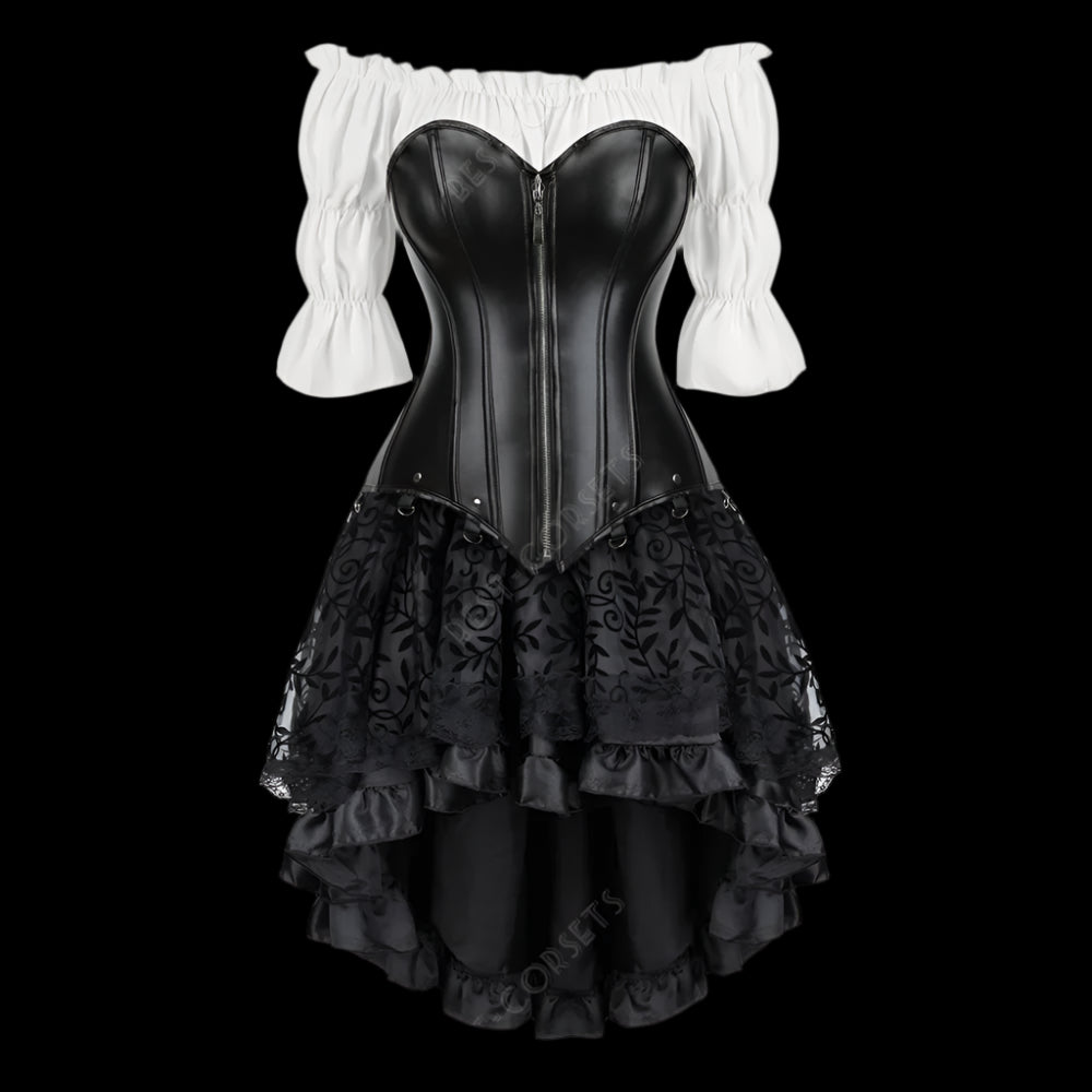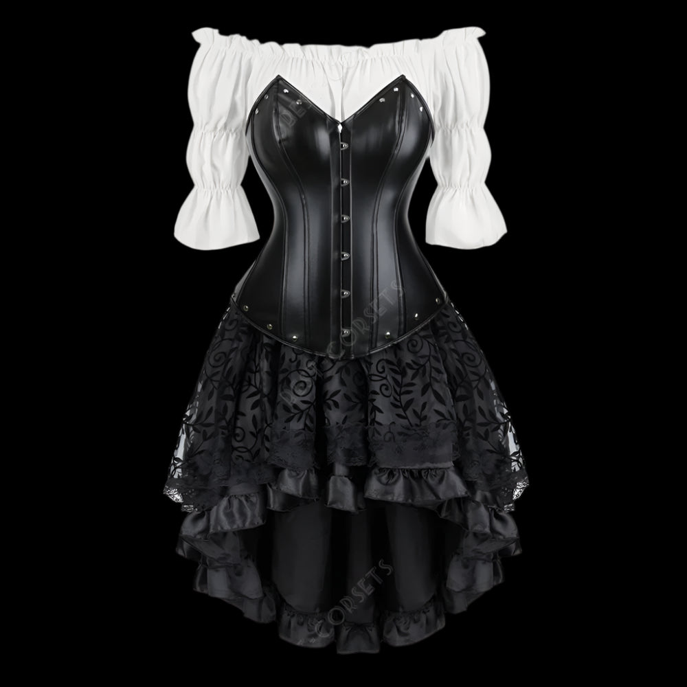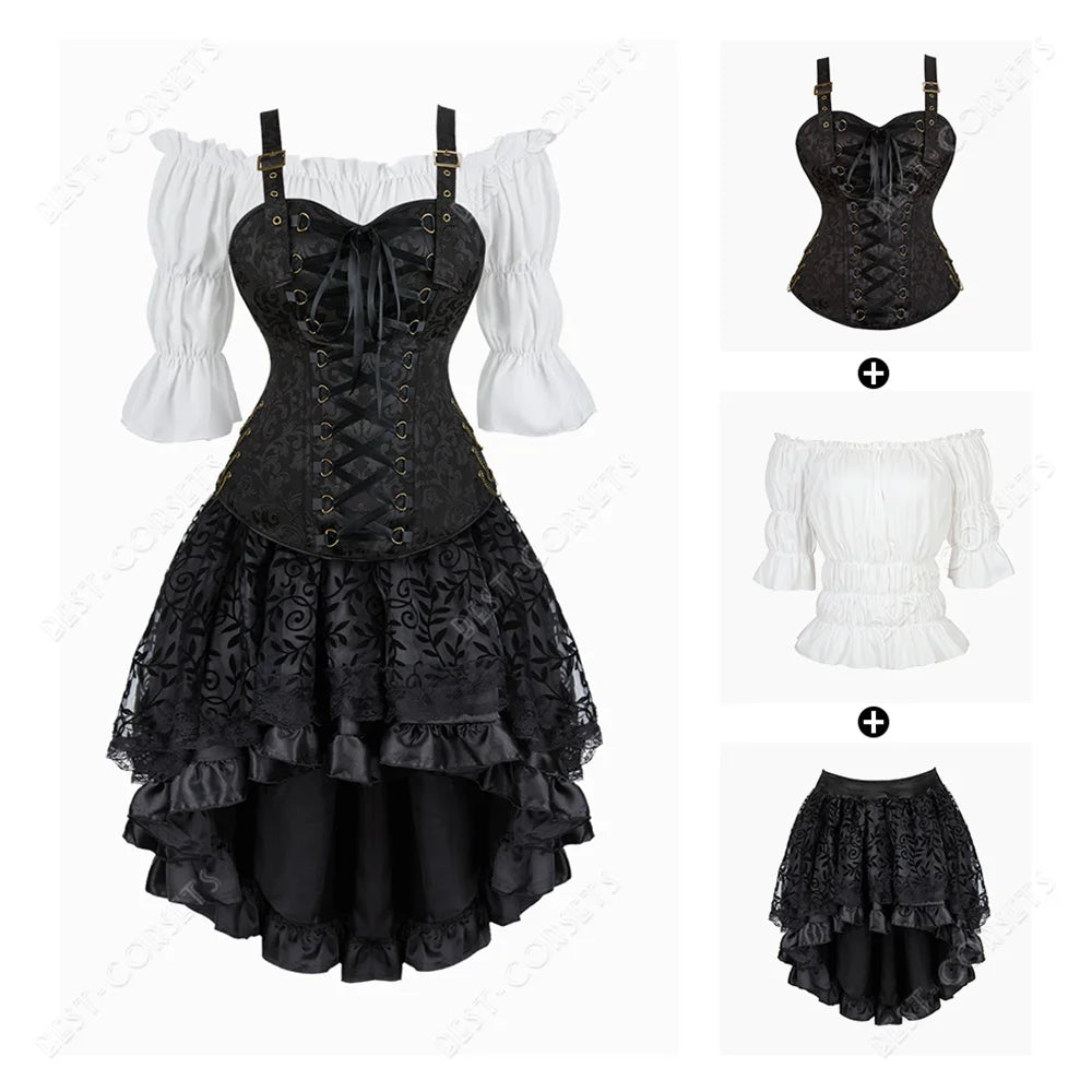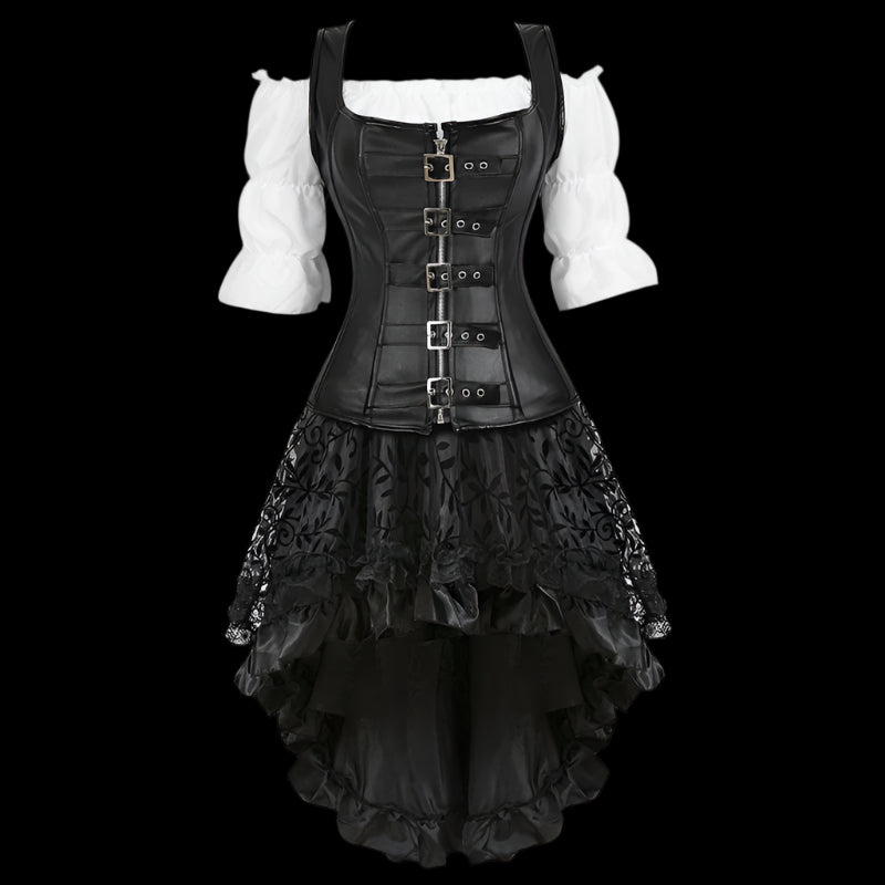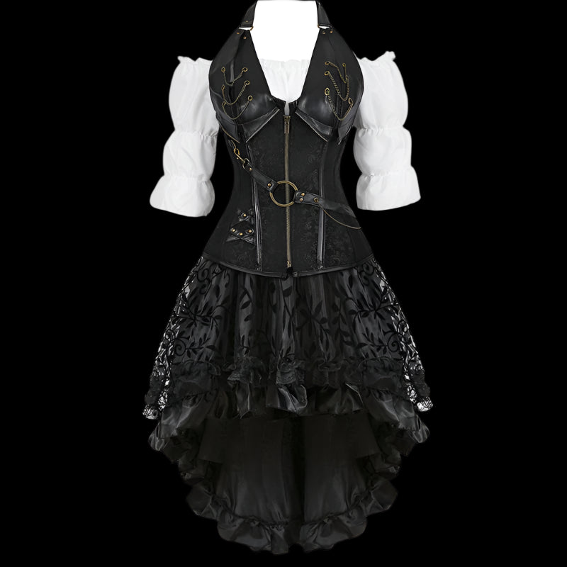Step into a world of mystery and power with this Viking Women's Black Corset Dress. Whether you're setting sail as a fearless pirate, making a statement at a steampunk convention, or captivating the crowd at a Renaissance fair, this three-piece outfit combines gothic charm, medieval grace, and Viking boldness.